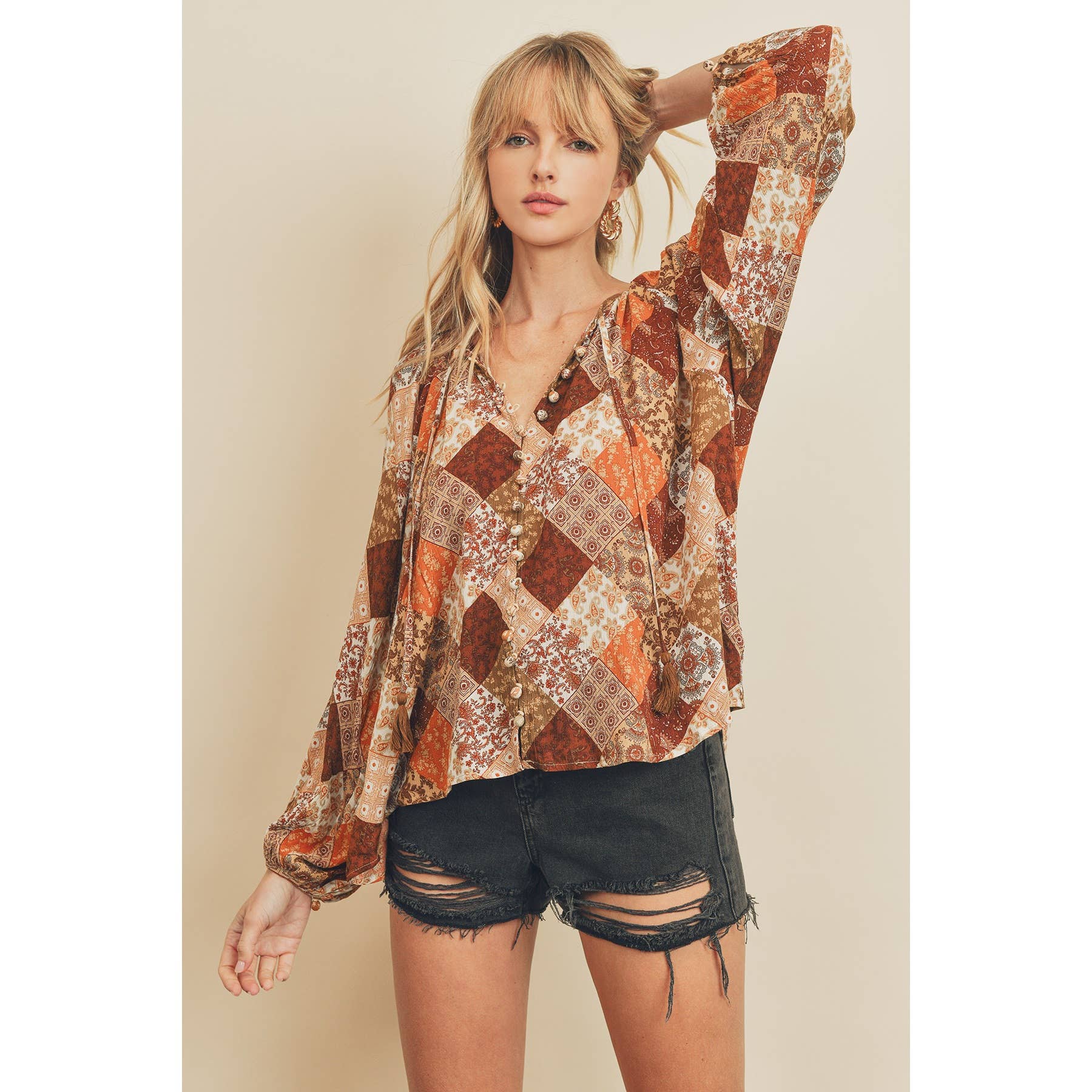 This paisley diamond pattern print, relaxed fit top features a tasseled tie detail on the round neckline and button down closures. Model is 5'9" and wearing size Small. Made from 100% Rayon. Perfect for fall! Pair with a denim jacket or blazer to complete the look.